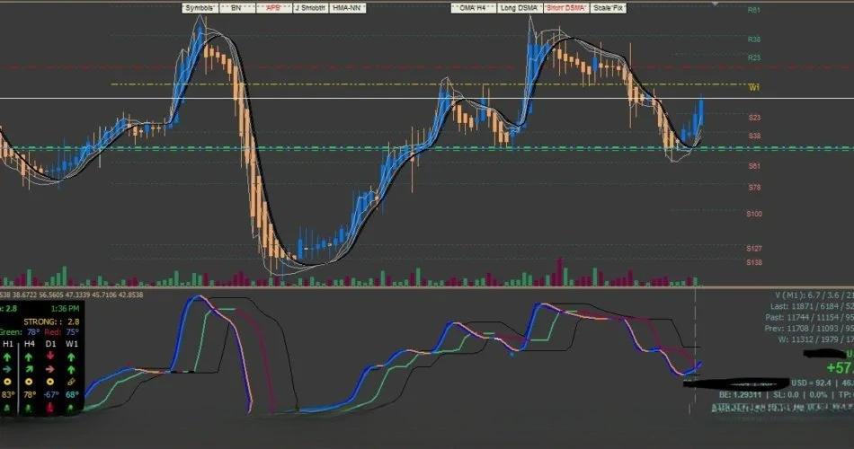 系统内的移动平均大多为线性成交量加权,并应用了基于Jurik的移动平均平滑滤波器(部分指标如此,其余则采用基于价格的自适应计算),之后还加入了DSMA滤波器(John F. Ehlers的偏差缩放移动平均)。此外,系统还融合了其他工具……例如回归分析工具,可在普通收盘价和Heiken Ashi – APB收盘价之间即时切换。系统内移动平均的周期计算是基于当前主导周期动态分配/计算的,该算法由John F. Ehlers提出。