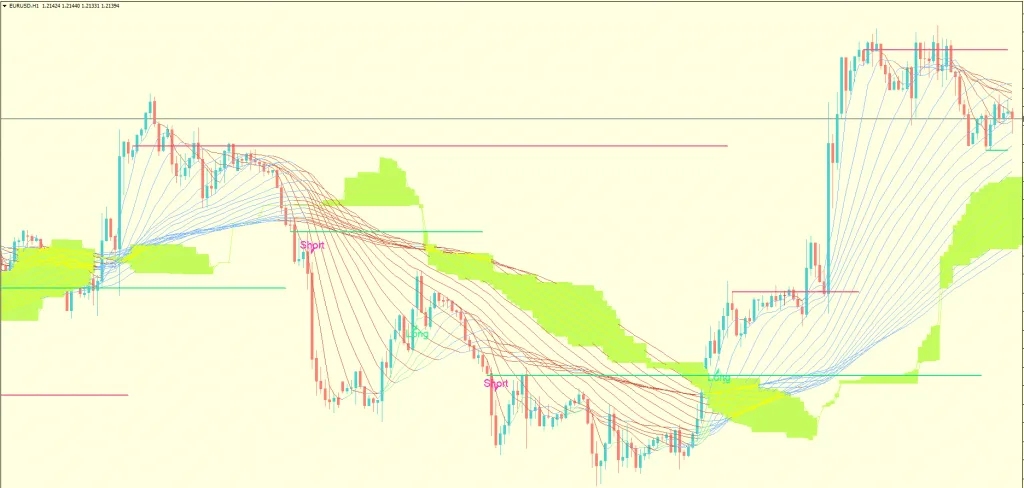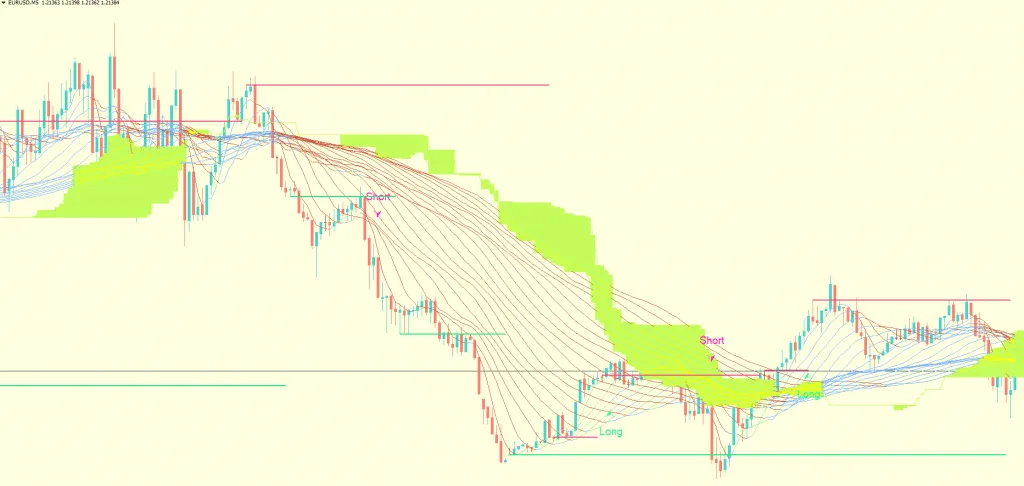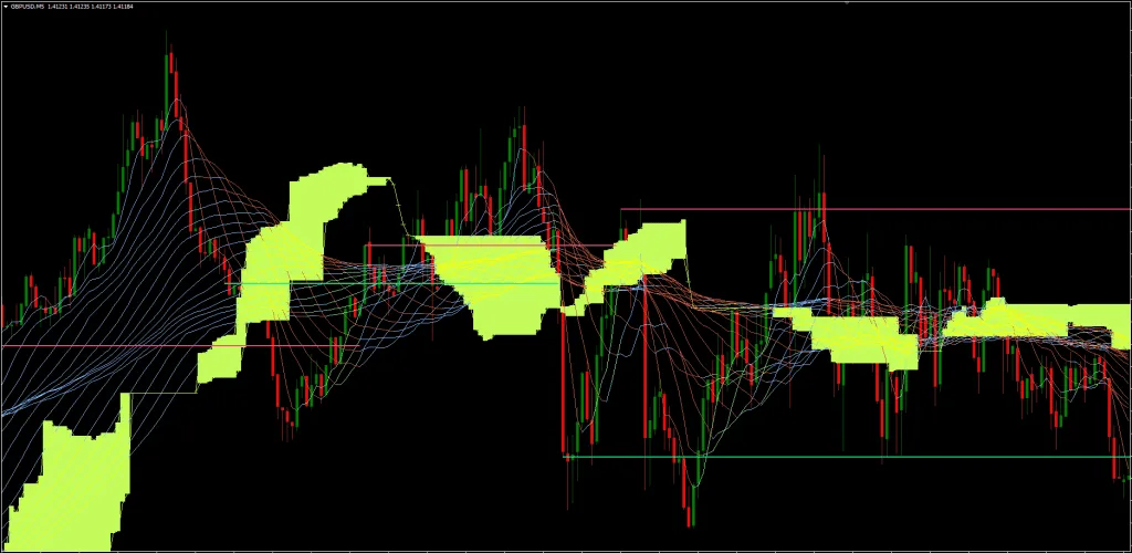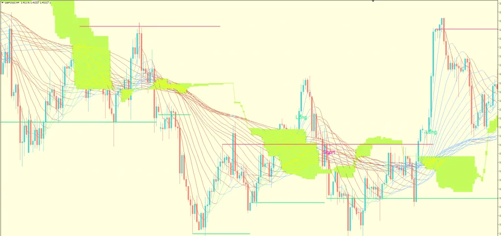 TREXPER 指标是一个不重绘的交易系统。这款免费的外汇指标基于唐奇安通道指标构建。它通过计算过去N个周期内的最高价和最低价来形成通道。最高价与最低价之间的区域,就是所选周期的通道。该通道与另一个强大的指标——移动平均线带——结合使用。移动平均线带由18条不同周期的移动平均线同时绘制在图表上构成。
