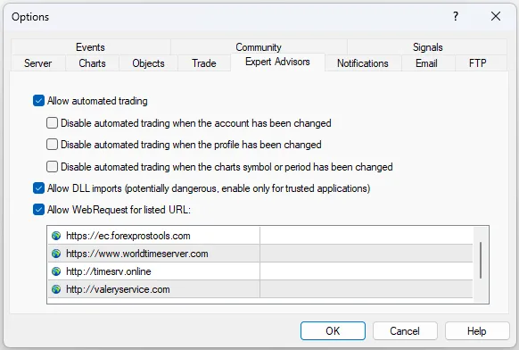 打开 工具 –> 选项 –> 智能交易系统。勾选“允许对指定URL的WebRequest”选项,并添加以下地址:“https://www.worldtimeserver.com/”,然后点击“确定”。EA将从指定网站获取新闻数据。
