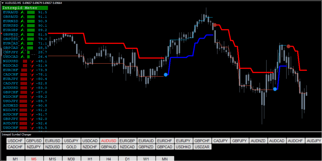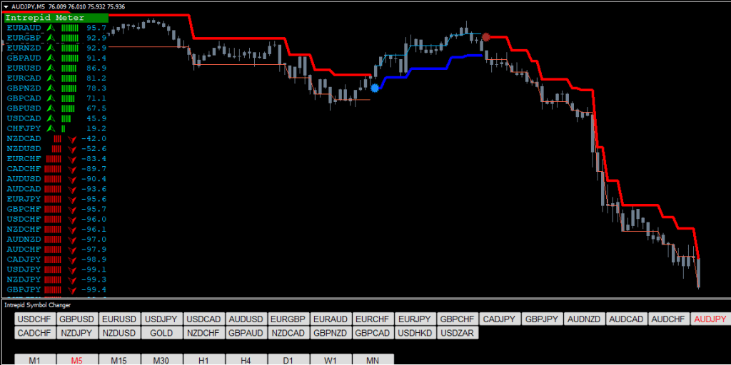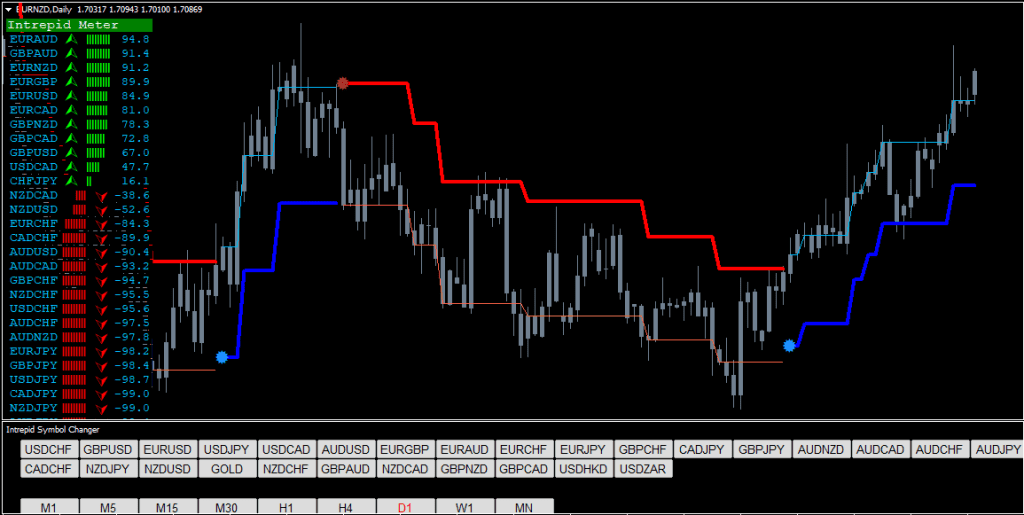 Forex Intrepid 免费外汇指标系统可以提供交易信号,你可以直接采纳这些信号,或者结合你自己的额外图表分析来进一步过滤信号,后者是推荐的做法。虽然所有经验水平的交易者都可以使用该系统,但建议先在 MT4 模拟账户上进行练习交易,直到你能够持续稳定地获利并有足够信心进行实盘交易。